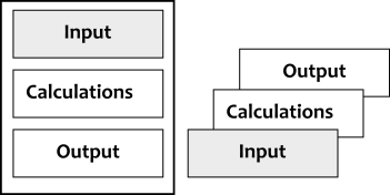 For smaller models, you can use different sections within a single worksheet (e.g., input at the top).